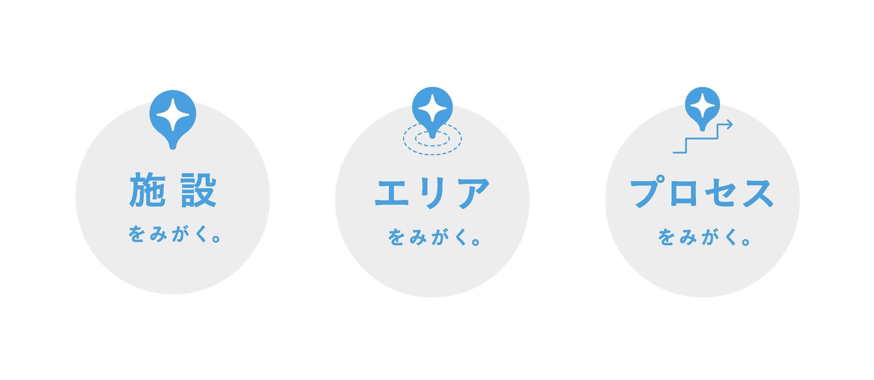 ロゴマークには、「行き先」や「場所」等を表す地図のピンをモチーフに、「磨き」や「楽しさ」等を表すマークを入れ、“磨き上げた施設を人が集う場所に輝かせていく”という意味を込めています。