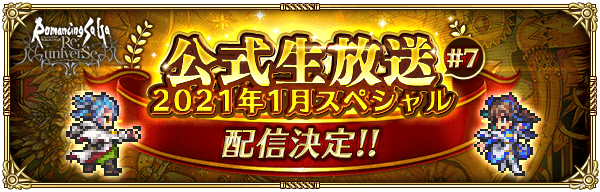 『ロマンシング サガ リ・ユニバース』の公式生放送を2021年1月28日(木)に実施いたします。新年初となる今回の生放送は、ユーザーの皆様から寄せられたアンケートを中心に回答していく新年特別編!今回もゲームの最新情報をお届けしますので見逃さずにご覧ください!
