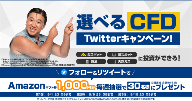 本キャンペーンは、より多くのお客様に金スポット・銀スポット・原油・天然ガスが少額から取引できる新商品『選べるCFD』を知っていただくため、Amazonギフト券1,000円分をプレゼントするTwitterキャンペーンとなります。どなたでもご参加いただけますので、ぜひフォロー&リツイートをご検討ください。