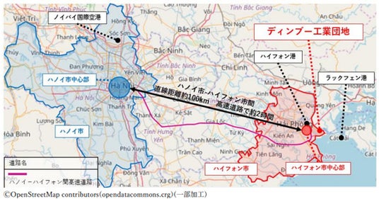 本物件が立地するディンブー工業団地は、下図のとおり、ベトナム北部最大の港湾都市であるハイフォン市に位置しており、また同市と首都ハノイ市は主要幹線道路で結ばれておりアクセスに優れていることから、広域物流拠点として高い優位性を有しています。