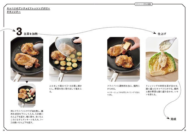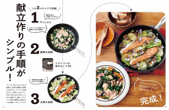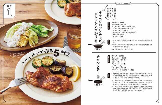 『フライパン1つで2品献立』は、フライパン1つだけで夜ご飯の献立ができるレシピを紹介するレシピブック。副菜、主菜の順で作るシンプルな手順で、ご飯づくりをずっと簡単にしてくれます。