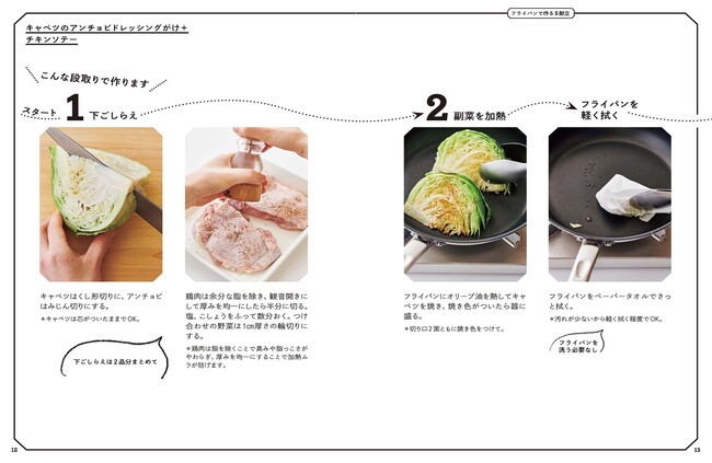本書で紹介する献立はすべて1パターンで完成します。フライパンで副菜を作り、そのまま同じフライパンで主菜を作るだけ。手早く作れるおかずだけなので、2品ともアツアツのまま食べることができます。