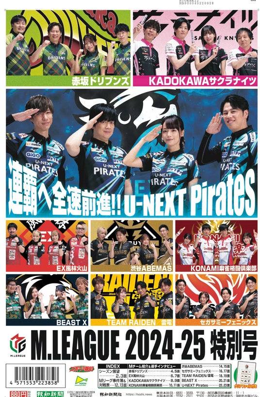昨シーズンの優勝チーム「U-NEXT Pirates」や昨シーズンから加わった「BEAST X」を含めた全9チームで優勝を争います。特別号には、これら全9チームの紹介に加え、メンバー36人の、今シーズンの抱負、目指すところを語ってもらったインタビューや、昨年も好評いただいたリーグ戦で起こった様々なドラマを、スポーツ新聞ならではの視点とレイアウトでビジュアライズした「Mリーグ事件簿」を「番外編」を加えて掲載。読み応え十分で、Mリーグ観戦ガイドとしてファン必携の特別号です。A4クリアファイルが付いて880円とお買い得な商品となっています。