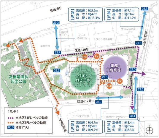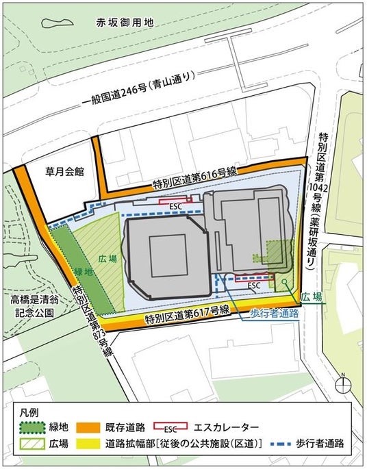 緑の拠点である赤坂御用地や高橋是清翁公園から南側市街地へ連続する緑のネットワークの形成を図るため、高橋是清翁公園と一体となる緑地(緑道)および広場を新たに整備します。