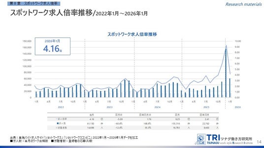 1. スポットワークの求人倍率は4.16倍。前年同月から1.76ポイント増加。