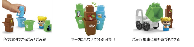 ごみ収集車とキャラクターを含めた全17ピースで、ごみの分別やリサイクルについて学ぶことができるブロックセットです。ごみ箱にはそれぞれマークが描かれていたり色分けされたりしているので、それに合わせてごみを分別することができます。牛乳パックなどの紙類はリサイクル、生ごみはコンポストすることもできます。ごみを分別して収集車に積む遊びを通して、色の識別や手先の器用さを育むだけでなく、環境にやさしいくらしについて考えるきっかけづくりにもなります。