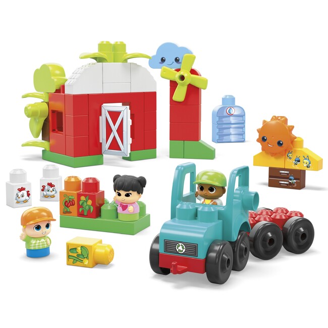 トラクターとキャラクターを含めた全51ピースで、野菜や、ニワトリを育てたり、雨をためて作物に水をあげたり、サステナブルなエコファーム体験ができるブロックセットです。収穫した野菜はトラクターに乗せて出荷することができます。作物の品質を保ったり、トラクターの環境負荷を減らすために近くのお友達に届けたりと、お子さまの想像力を鍛えるだけではなく、作物の育成やニワトリのお世話を通して、社交性、情緒、手先の器用さを育むことができる商品となっており、生物の多様性への理解や、他の生き物への尊重などがテーマになっているセットです。