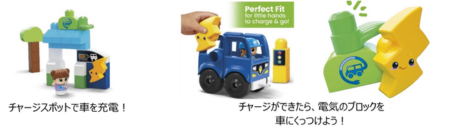 自動車とキャラクターを含めた全34ピースで、地球にやさしい移動手段について学ぶことができるブロックセットです。出発前に充電スポットで車に電気をチャージし、準備ができたら手で走らせてごっこ遊びを楽しむことができます。手先の器用さとともに社交性や情緒を育み、また環境にやさしいくらしに目を向けるきっかけともなります。友達と同乗することで車一台で移動できエコにつながるなど、様々な方法で環境について学ぶことができる商品です。