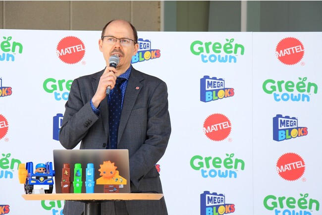 最初にマテル・インターナショナル株式会社 マーク・パンサール社長より、「我々、マテル・インターナショナルは次代を担う子供たちに、子供時代の素晴らしい未知の発見、気づきを与え、最大限の可能性を引き出すお手伝いをすること、そしてミッションは遊びを通じて、子供たちにインスピレーションを与え、楽しみ、成長をはぐくむ、イノベイティブな製品と経験を創出することです。マテル・インターナショナルの3つのゴールは1.2030年までに、製品およびパッケージにおいて、リサイクル素材や再生可能素材、またはバイオベースプラスチック材料を100%使用する2.製品およびパッケージに使用する、紙および木製繊維において、リサイクル素材、またはFSC(Forest Stewardship Council)認証素材の含有率95%を維持する3.2030年までに、製品ごとにプラスチック包装を25%削減する(2020年基準)ことです。」と宣言し、「今回の新製品メガブロック グリーンタウンは量販店流通玩具において世界で初めてカーボンニュートラル認証を取得※1した製品で、子供たちが遊びを通して自分たちの未来を想像し、世界は”Ours to Build” - より良い世界はみんなでつくりあげるものであることを教えるように設計されています。」と挨拶されました。