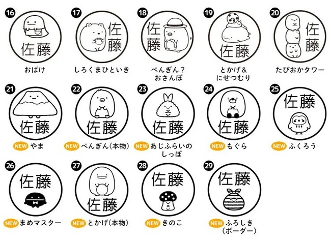 イラストはこちらの29種類。従来の20種類に、やま、ぺんぎん(本物)、あじふらいのしっぽ、もぐら、ふくろう、まめマスター、とかげ(本物)、きのこ、ふろしき(ボーダー)の9匹が追加されました。はんこの枠の中でもすみっこにいるキャラクターはどれも愛らしいものばかり。