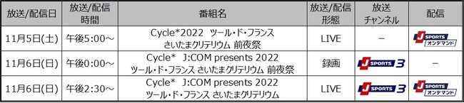 さらにレース前日の11月5日(土)には、J SPORTSによるイベント「2022ツール・ド・フランスさいたまクリテリウム 前夜祭スペシャル」(詳細別紙)を3年ぶりに開催します。