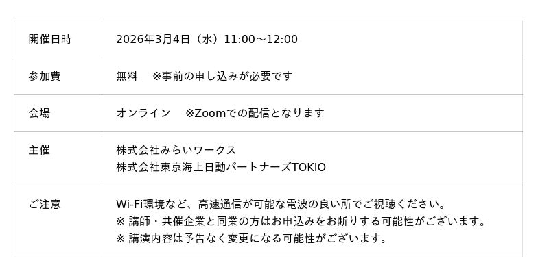 即戦力となるプロフェッショナル人材のマッチングサービス『フリーコンサルタント.jp』を展開する株式会社みらいワークス(本社:東京都港区、代表取締役社長 岡本 祥治、以下「当社」)は、2026年3月4日(水)株式会社東京海上日動パートナーズTOKIOと共催でオンラインセミナーを開催します。