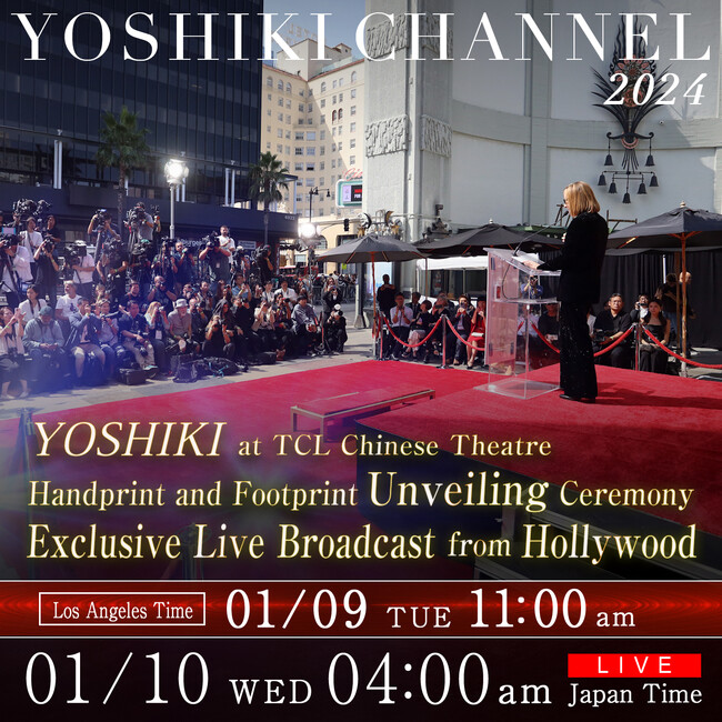 日本時間1月10日(水)午前4:00(現地時間1月9日午前11:00)より、ニコニコチャンネル(日本)およびYouTube Channelメンバーシップ(日本含む全世界)で配信される『YOSHIKI CHANNEL』にて、ハリウッドのTCLチャイニーズ・シアターで開催するYOSHIKIの手形・足形完成をお披露目するセレモニーの模様を生中継することが決定した。