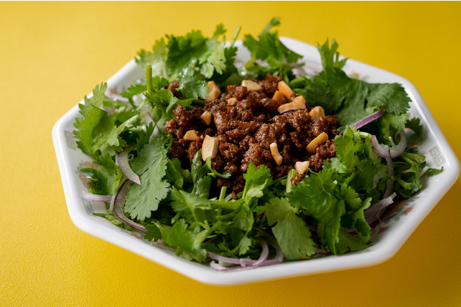 店内仕込みの特製ジャー醤が乗った香菜サラダ。肉味噌と絡めてお召し上がりください。