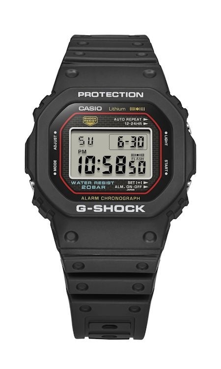 1983年に発売した初号機「DW-5000C」の復刻モデルです。バンドの長さや、初号機に施されたバンド穴部分の凹凸形状などさまざまな部分で初号機の要素を踏襲しています。高輝度なLEDバックライトや、環境負荷低減につながるバイオマスプラスチックを採用するなど、一部の仕様をアップデートしています。