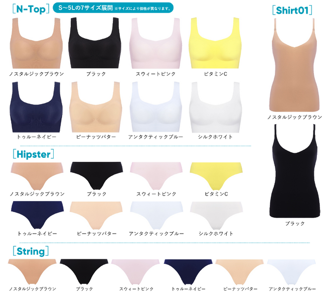 今回のリニューアルでは、着けごこちのよさやカラー展開だけでなく、着こなしの楽しさも進化!ショーツはバリエーション豊富な3型に加え、新たにパッドなしのキャミソール[Shirt01]をご用意しました。同色で、あるいは色違いで、[N-Top]に重ねるレイヤリングスタイルを提案します。