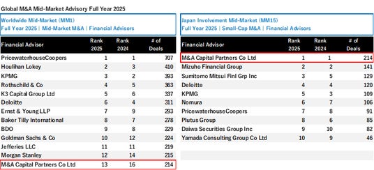 M&Aキャピタルパートナーズ株式会社(東京都中央区・代表取締役社長 中村悟、以降「MACP」)は、LSEG(ロンドン証券取引所グループ)データによる中規模市場M&Aリーグテーブル「Global M&A Mid-Market Advisory」「Global M&A Small-Cap Advisory」案件数ベースのランキングにおいて、「Worldwide Mid-Market/Small-Cap」で2年連続ランクインし、「Japan Involvement」において1位を獲得しましたので、お知らせいたします。