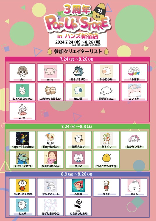 株式会社ハンズ(本社:東京都新宿区)は、2021年8月より開始した、キャラクターを生み出すクリエイターの活動発信プラットフォーム「CHAREC(キャレク)」が3周年を迎えたことをお知らせいたします。この間、店頭でキャラクターづくりワークショップや物販イベントを開催するなど、クリエイターとファンであるお客様とのコミュニケーションを育ててまいりました。この度、運営開始より3周年を記念して、ハンズ新宿店にて7月24日(水)から8月26日(月)までの34日間、総勢28名のキャラクリエイターが出展するイベントを開催しております。新作のオリジナルキャラクターグッズ販売や、リクエストイラスト会、キャラクターづくりワークショップなどバラエティ豊かな企画が盛りだくさんのイベントです。