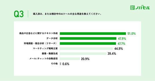 3.現在AIを活用している/検討中のマーケティング業務は「商品や広告のテキスト作成」(51.0%)「データ分析」(47.9%)、「市場調査・リサーチ」(47.7%)などの作業が上位に