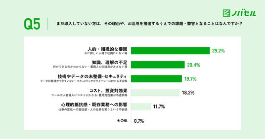 まだマーケティング業務にAIツールを導入していないと回答した方に、その理由やAI活用を推進するうえで最も課題・弊害となることを質問をしたところ、人的・組織的な要因として「AIに詳しい人材が社内にいない・組織としてAI導入の優先度が低い・経営層、上司の理解がない」という回答が29.2%でトップになりました。また、知識・理解の不足として「何ができるのか、どこに使えるのかわからない・業務とAIの接点がみえていない・成功事例がないためイメージしにくい」(20.4%)との回答も見られました。