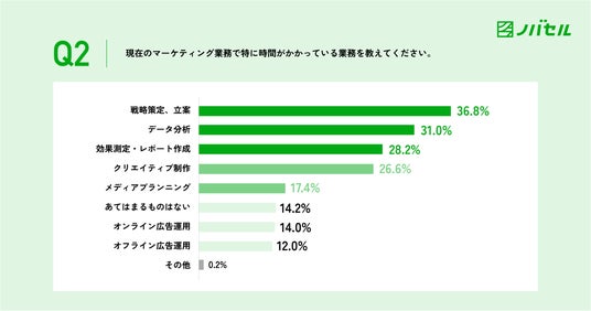 現在のマーケティング業務で、特に時間がかかっている業務は「戦略策定・立案」が36.8%、「データ分析」が31.0%、効果測定・レポート作成が28.2%。クリエイティブ制作は26.6%となりました。