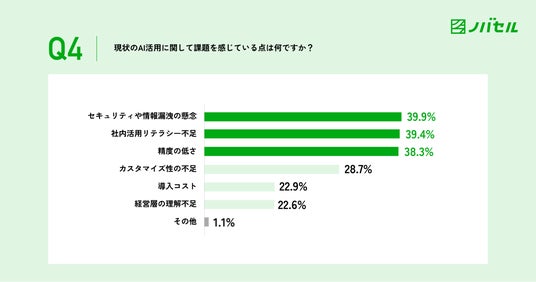 4.現状のAI活用に関して課題を感じている点は「セキュリティ、情報漏洩」(39.9%)「社内リテラシー不足」(39.4%)を挙げる人が多い
