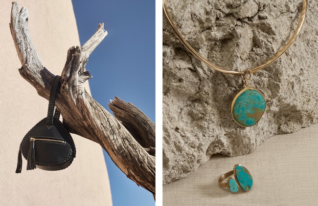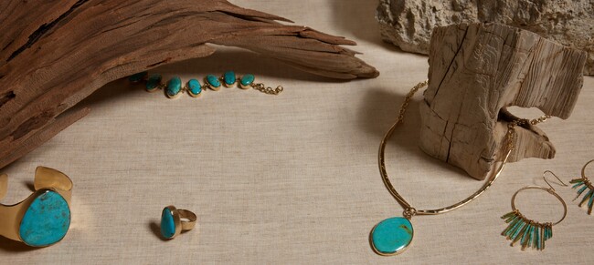 ジュエリーコレクションからは、ターコイズの天然石を手作業で仕上げたスタッドピアスや、首元をエレガントに演出してくれるチョーカーがラインナップします。ターコイズは、使い込むほど風合いが魅力のゴールドブラスを採用。宇宙が見えるかのような不思議な魅力を放つブラックのピアスや、トルマリンの神秘的な魅力が美しいネックレスをはじめ、いつもの装いに女性らしさや上品なエレガントさを叶える上質なジュエリーが充実します。