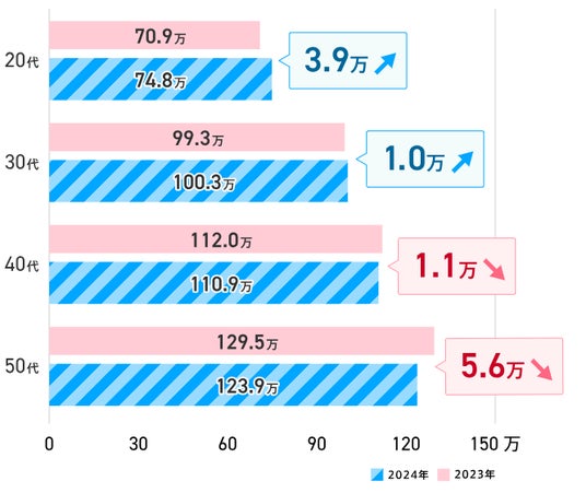 【年代別】20代と30代は増加、40代と50代は減少する結果に。30代、40代、50代は100万円超え