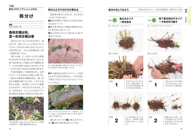 春と秋は株分けの適期です。数年経過し、大きく育った宿根草は中心部が衰えはじめるので、株分けが必要です。株分けのコツと、株分け苗の植えつけもガイドしています。