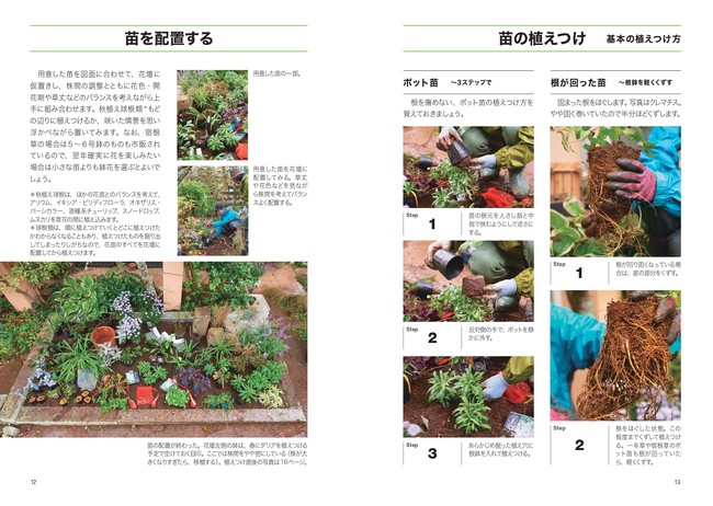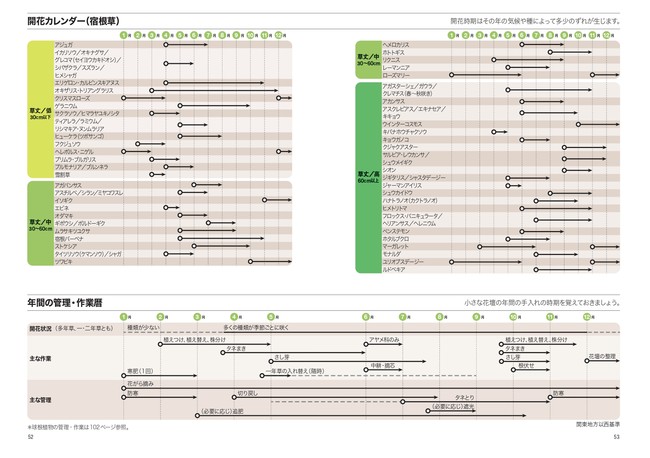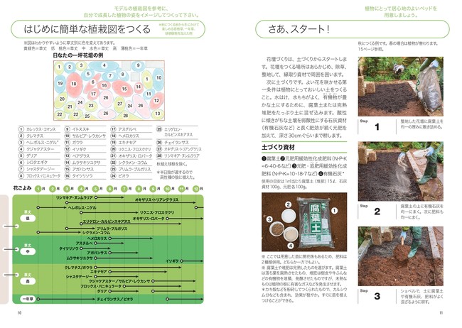小さな庭のつくり方を、初めての方でもわかりやすいように丁寧に紹介している本書。まずは、自分の庭の日当たりを踏まえた植栽プランの立て方からはじまります。一年中、花が絶えない花壇となるように開花時期を参考に、手前から低中高と草丈がバランスよく配置するコツをお教えします。