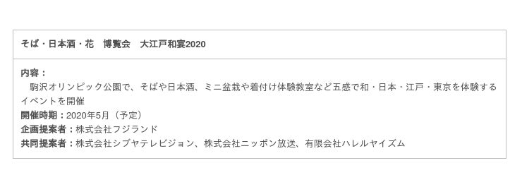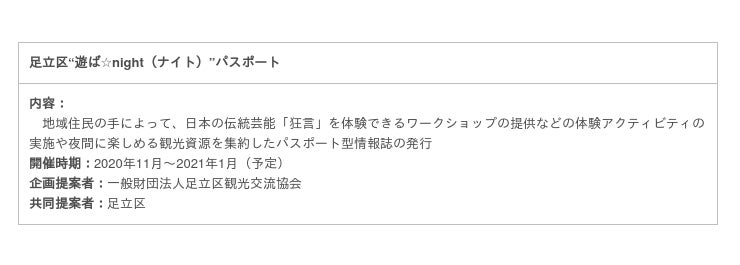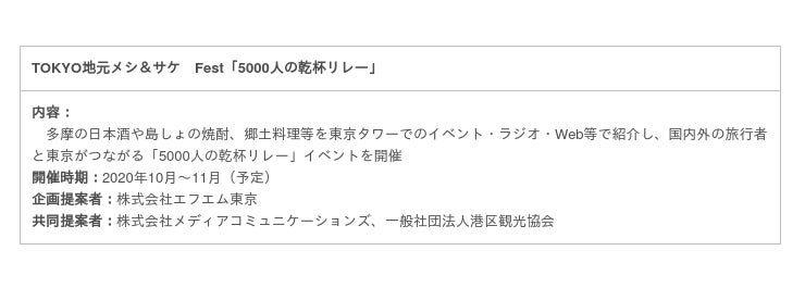 株式会社日本旅行(本社:東京都中央区、代表取締役社長:堀坂明弘)、株式会社ポニーキャニオン(本社:東京都港区、代表取締役社長:吉村隆)では、東京観光財団より委託を受け、支援を希望するイベント企画の募集、イベント選定後の広報支援を行う、イベント開催支援事務局を運営する。