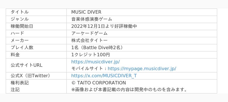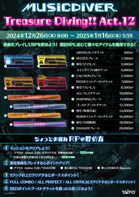 株式会社タイトー(本社:東京都新宿区)は、アーケード用音楽体感演奏ゲーム『MUSIC DIVER 』において、2024 年12 月2 6 日(木) に アップデートを実施いたします。アップデート により、音楽ユニット「YOASOBI 」の人気楽曲「アイドル Anime Edit 」を含む全5 曲を追加するほか、様々なアイテムを獲得することができる期間限定のゲーム内イベント「Treasure Diving!! Act.12 」を開催いたします。