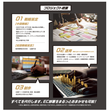 本事業では、顧客企業はEC業務の戦略から運営、制作までの運営を一気通貫で全面委託でき、いわゆる「丸投げ」することが可能であることが特徴の一つ。