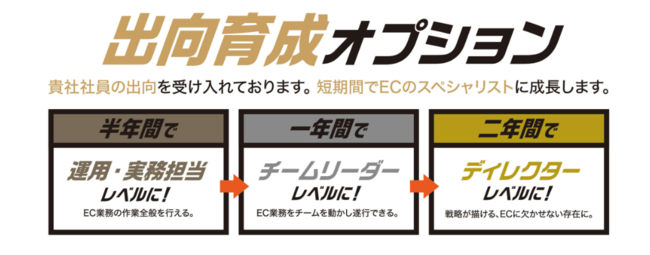 更に、業界初の顧客企業の社員の出向育成オプションを導入。このオプションを利用することで、本プロジェクトに社員を派遣して教育を任せることが可能であり、1年前後で1人前のEC人材へと育成可能のプログラムを用意。