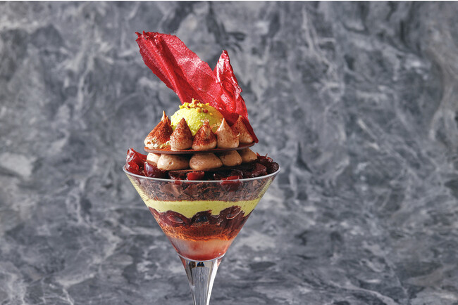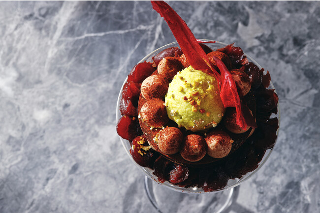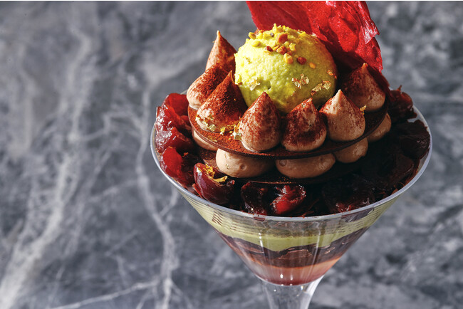 アートなフォルムのパフェの下の層には、グリオットチェリーのジュレの上にチョコレートクランブルをのせ、グリオットチェリーのコンポート、ピスタチオシャンティとチョコレートのビスキュイを重ねました。クランブルとビスキュイのサクサクとした食感と、まろやかなピスタチオムースにグリオットチェリーの酸味がアクセントになった絶妙な味わいをお楽しみいただけます。さらに、グリオットチェリーのアイスクリームとピスタチオダイスがかかったなめらかでコクのあるピスタチオのアイスクリームをのせ、その周りには、美しく二層に絞られたショコラシャンティを薄く繊細なチョコレートプレートで重ね合わせました。トップには、色鮮やかなグリオットチェリーのチュイルをのせ、スタイリッシュなフォルムに仕上げました。食べ進めていくごとに違った表情が見える、チョコレートとピスタチオの豊かな風味が織りなすハーモニーを味わえる極上な逸品です。