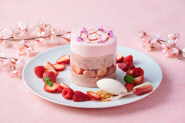 スフレパンケーキには桜のペーストと桜の葉をパウダー状にしたものを生地に練りこみ、ふわふわとした食感の中に、ほんのりとした桜の香りと甘みを感じていただけます。ホールのフレッシュな苺と苺のガナッシュを挟んで、異なる味わいと食感を演出いたします。さらに、パンケーキの外側のフィルムを引き上げると、フランボワーズ風味のまろやかな生クリームが美しく流れ落ち、ムービージェニックな新感覚の一品です。サイドには、サクサクとした食感が楽しめるクレープの生地を薄くして焼いたフィアンティーヌにさっぱりとした口当たりの桜風味のアイスクリームをのせ、色鮮やかな苺とレッドカラントとラズベリーを添えました。さらに、甘酸っぱい苺ソースと濃厚な味わいの練乳のスポイトを用意し、お好みで加えていただくことで、より一層風味豊かにお楽しみいただけます。