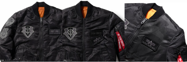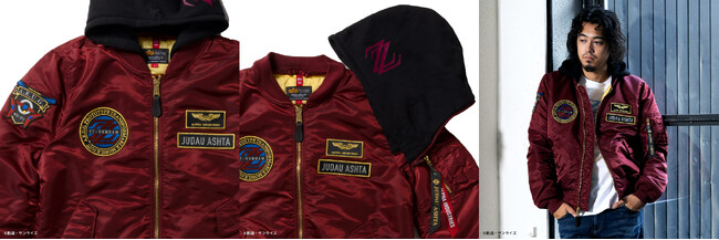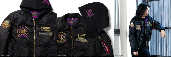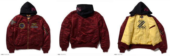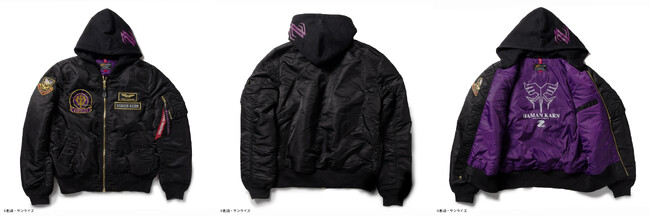 『機動戦士ガンダム』よりブラックのシャドーカモフラージュ柄のMA-1 ZEON FORCESモデル。『機動戦士ガンダムZZ』より劇中の衣裳よりインスパイアされたフード付きのMA-1 NATUSモデルからバーガンディー生地のジュドー・アーシタモデル、ブラック生地のハマーン・カーンモデルを展開致します。