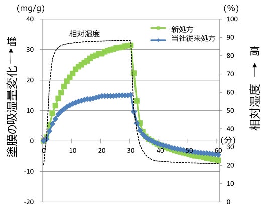 さらに、密閉空間で相対湿度を21%から88%に変化させた際の塗膜の重量変化を測定したところ、相対湿度が88%の時に新処方製剤は従来製剤の最大2倍以上の高い吸湿性を持つことが明らかになりました(図3)。