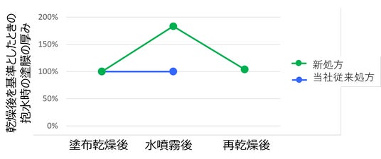 その結果、従来製剤は水を噴霧しても膜厚の変化はなかったものの、新処方製剤は水を噴霧すると膜の厚さが増し、高い抱水性を持つ(水を多く抱えられる)ことがわかりました。また、再乾燥後には膜が薄くなったことから、新処方製剤の塗膜は外部環境に応じて吸放湿することが考えられます(図2)。