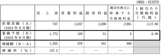 前記施策に加えて、当中間連結会計期間においては、株式会社ドリームプラネット及び株式会社サンライズジャパンを取得したこともあいまって、2025年8月期連結会計年度の売上高は1,772百万円と前期実績の約2.4倍と大幅に増加し、営業利益は129百万円、経常利益は51百万円と前期比で3億円以上の改善をし、親会社株主に帰属する当期純利益についても5百万円と前期比約10億円の改善となることを見込むこととなりました。