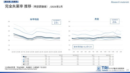 RPO(採用業務代行)・採用コンサルティングを行う株式会社ツナググループ・ホールディングス(本社:東京都中央区、代表取締役兼執行役員社長:米田 光宏)を母体とする、多様な働き方の調査研究機関「ツナグ働き方研究所(拠点:東京都中央区、所長:大野 博司)」は、官公庁などが発表する労働市場関連のデータをキュレーションしつつ、分かりやすくまとめた「労働市場データレポート」を毎月発表しています。今回は3月下旬に発表された最新データをもとに、2026年2月度のレポートについて、とりまとめましたのでご報告いたします。