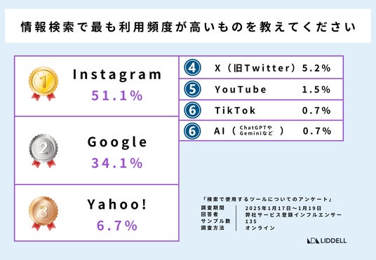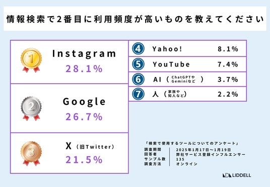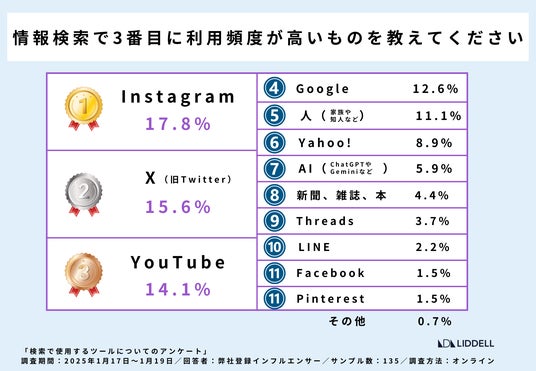 今回は当社運営のマーケティングプラットフォームLIDDELL INFLUENCER WORKSPACE(LIW)に登録しており、Instagram、X、TikTok、YouTube等のSNSを満遍なく利用するインフルエンサーの中から、ランダムに 135名を選定し「検索で使用するツール」について行ったアンケート調査の最新結果をレポートいたします。