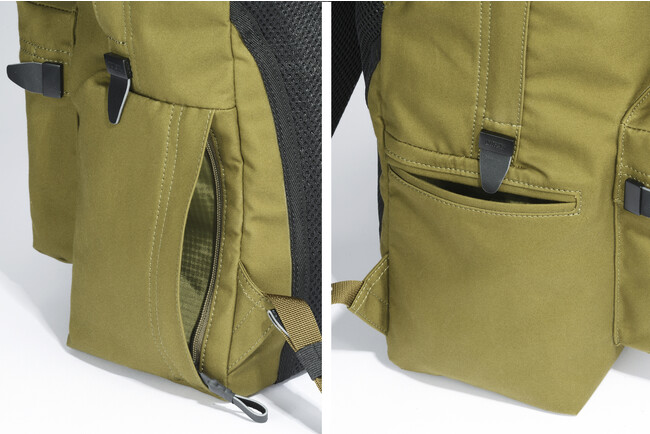 右サイドに片掛け状態でアクセスしやすいファスナーポケットを配置し、左サイドに折り畳み傘やペットボトルを差し込めるオープンポケットを配置。