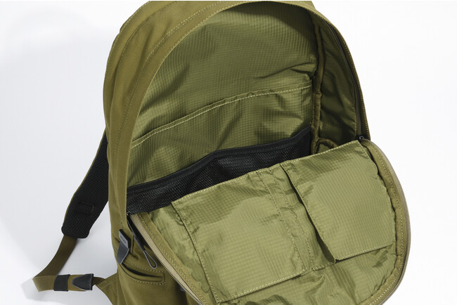 デイパックとしては珍しい、2気室タイプ。13.3inchPCが入るクッション性を備えた背面収納スペース内に、USBメモリ等の小物を収納できるフラットポケット×3を配置。
