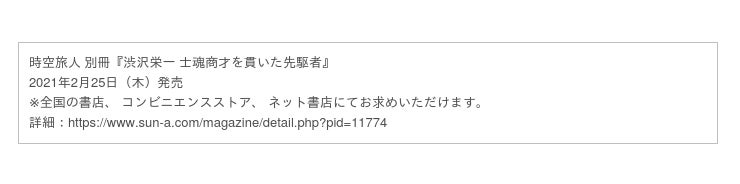 株式会社三栄(本社所在地:東京都新宿区、代表取締役社長:星野邦久)は、2021年2月25日(木)に時空旅人 別冊 『渋沢栄一 士魂商才を貫いた先駆者』を発売いたしました。