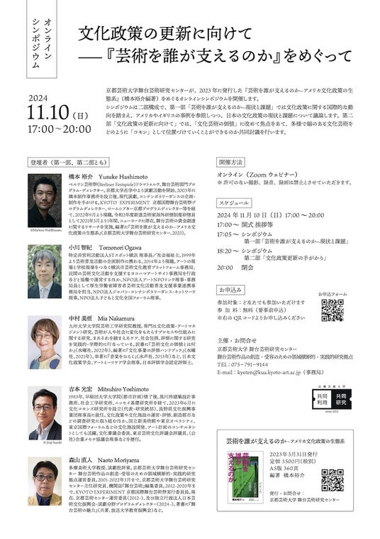 京都芸術大学舞台芸術研究センターが、2023 年に発行した『芸術を誰が支えるのか―アメリカ文化政策の生態系』(橋本裕介編著)をめぐるオンラインシンポジウムを開催します。登壇者には、橋本氏に加えて、小川智紀氏(特定非営利活動法人STスポット横浜理事長)、中村美亜氏(九州大学大学院教授/文化政策・アートマネジメント研究)、吉本光宏氏(文化コモンズ研究所代表)、森山直人氏(多摩美術大学教授/演劇批評)を迎えます。