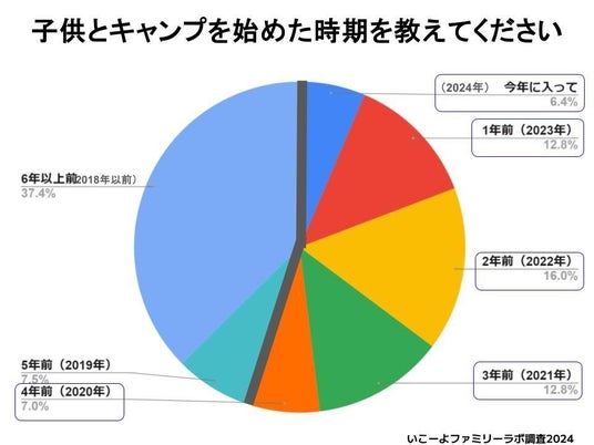 家族でキャンプをした経験があるファミリーに、子供とキャンプを始めた時期をたずねると、今年に入ってから(6.4%)、1年前(12.8%)、2年前(16.0%)、3年前(12.8%)、4年前(7.0%)という回答結果になり、2020年のコロナ禍以降にキャンプを始めた家庭が全体の55%を占めています。
