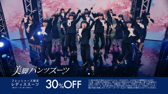 アメリカのオーディション番組でファイナリストとなり、世界中から人気を集めているダンスグループ「アバンギャルディ」が、はるやまのCMに初登場!CMは、メンバーによる「はるやま!」のナレーションとともに、スポットライトが当たるシーンからスタート。桜吹雪や大学の正門など、春の新たな門出を思わせる映像をバックに圧巻のダンスパフォーマンスを披露します。そしてCM中盤では、いつもの制服から美脚スーツ姿にチェンジ。アバンギャルディ初となる、スーツで踊る、躍動感あふれるダンスにご注目ください。ハイライトは、堂々とポーズを決める美脚カット。ダンサーならではのしなやかで美しい立ち姿に目が釘付けです。