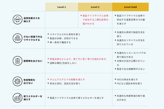 イトーキグループのESG戦略における重点テーマの一つである「資源循環促進」を進化、発展させていくため、「環境配慮型基準“Eco Level”」では環境配慮のためにイトーキが大切にしている「温室効果ガスを減らす」「少ない材料で作る/リサイクルする」などの5つの指針を設けています。