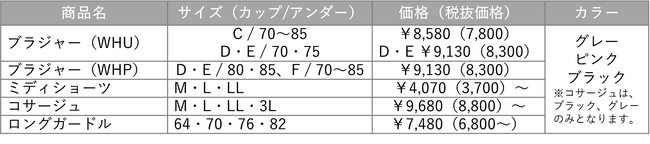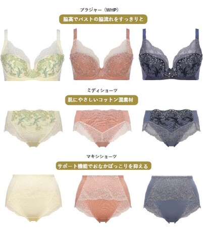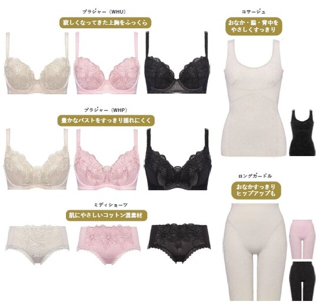 ブラジャーはサイズ別のニーズに応える2タイプのフィットで、サイズダウンしたバストをボリュームアップするブラジャー(WHU)と、豊かなバストを穏やかに引き上げ整えるブラジャー(WHP)をご用意。そして背筋をしゃんとサポートするコサージュ、ロングガードルをご用意しました。